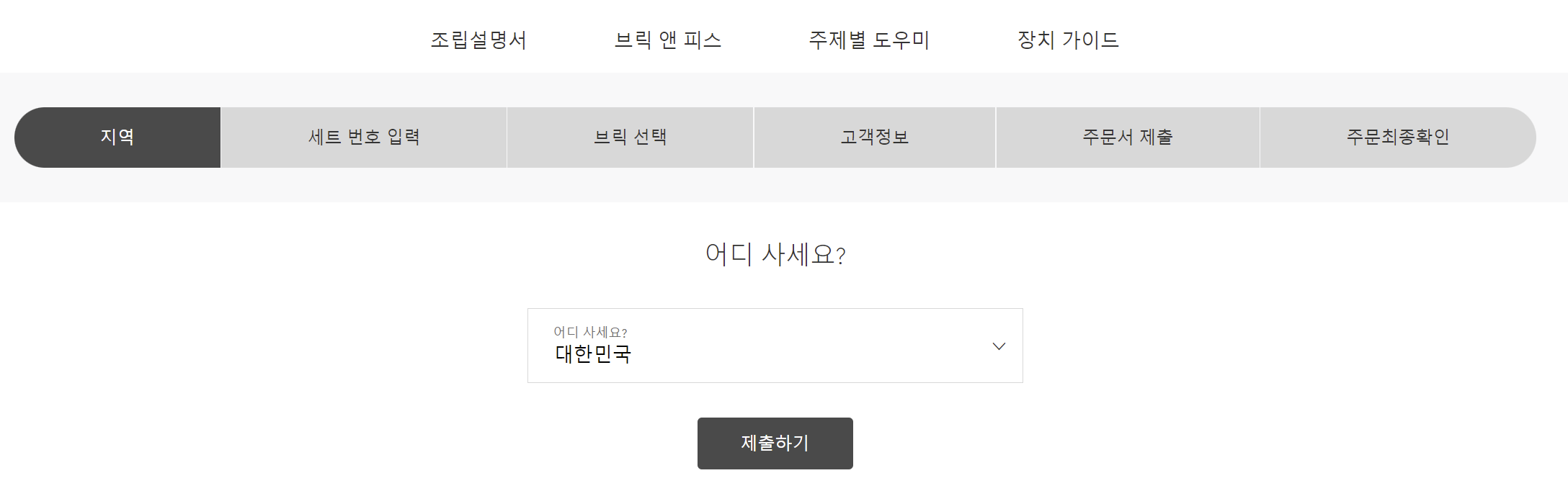 3. 지역 > 세트 번호 입력 > 브릭 선택 > 고객 정보 > 주문서 제출순으로 진행하시면 됩니다.
